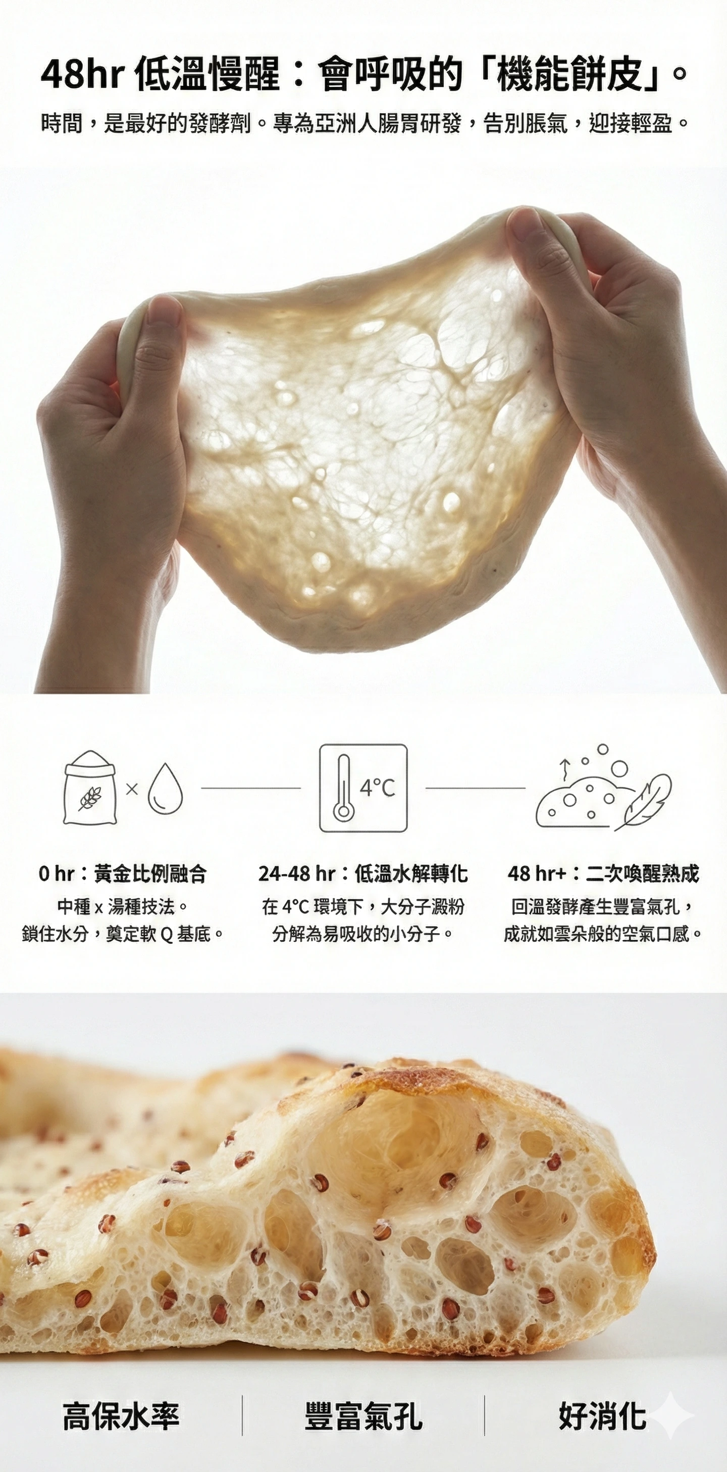 · 48hr 低溫慢醒:獨家長時發酵工法,餅皮輕盈好消化。