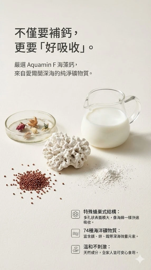 天然乳鈣、深海海藻鈣、與紅藜麥的溫柔交織,還原食材最純粹的營養與乳香。
