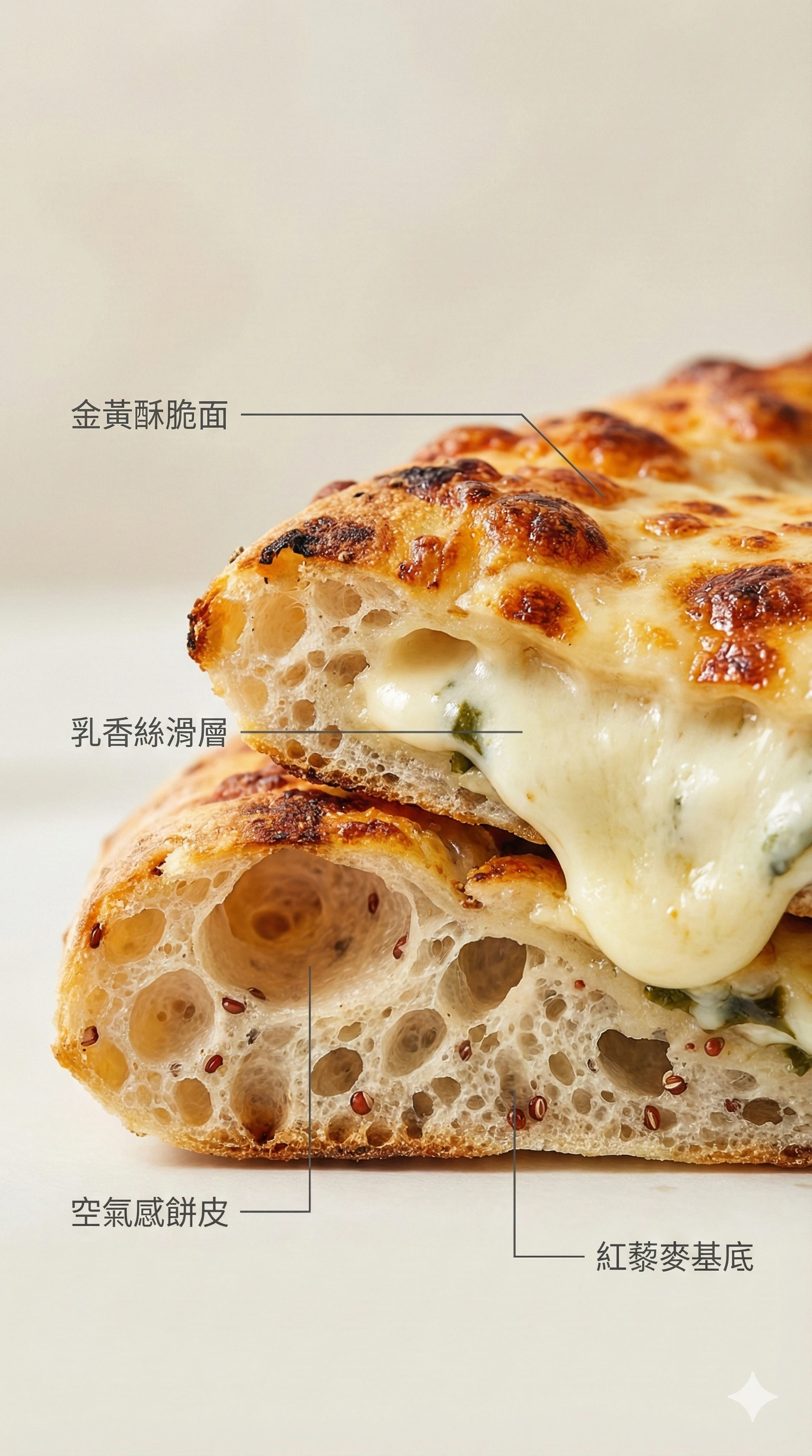 · 紅藜麥機能餅皮:選用超級食物「紅藜麥」入麵團,打造健康基底。